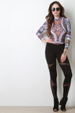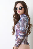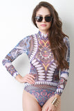 This bodysuit features semi-sheer mesh, mosaic pattern print, mock neck, long sleeves, and double snap button closure at crotch. Accessories sold separately. Made in U.S.A. 95% Polyester, 5% Spandex.