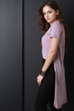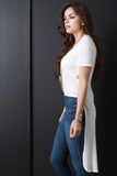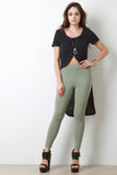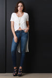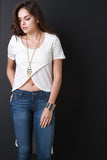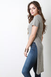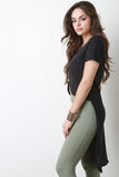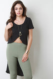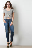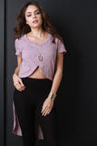 This top features a marled jersey knit fabrication, scoop neckline, short sleeves, holes and distressed detail, and faux wrap front design. Finished with a cropped high-low hemline.