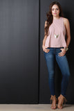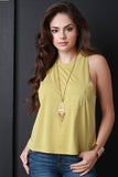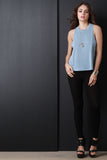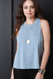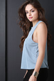 This jersey knit top features a crew neckline, sleeveless design with a racer back, left breast pocket, and an a-line cut fit. Accessories sold separately. Made in U.S.A. 73% Modal, 27 % Polyester.