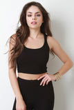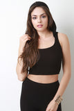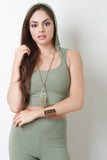 This crop top features rib knit fabrication, scoop neckline, sleeveless design, and finished with a hood. Accessories sold separately. Made in U.S.A.95% rayon, 5% Spandex.