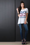 This tee shirt features a 99 freedom graphic print at front with contrast stripe knit fabrication at the back, cuffed short sleeve, and high-low hem. Accessories sold separately. Made in U.S.A. 56% Rayon, 15% Polyester, 15% Cotton, 14% Modal.