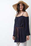 This cute top features a cold shoulder design, spaghetti straps, off the shoulder long flare sleeves, lace up front, embroidered cutout trim, lightweight woven fabrication, and a vegan leather braided belt. Accessories sold separately. 100% Rayon.