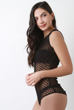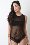 This bodysuit features a semi sheer mesh fabrication, polka dot pattern, round neckline, gathering detail, back keyhole with button closure at nape, finished with double snap closure at crotch. Accessories sold separately. Made in U.S.A. 60% Polyester, 40% Nylon.