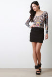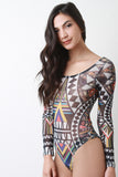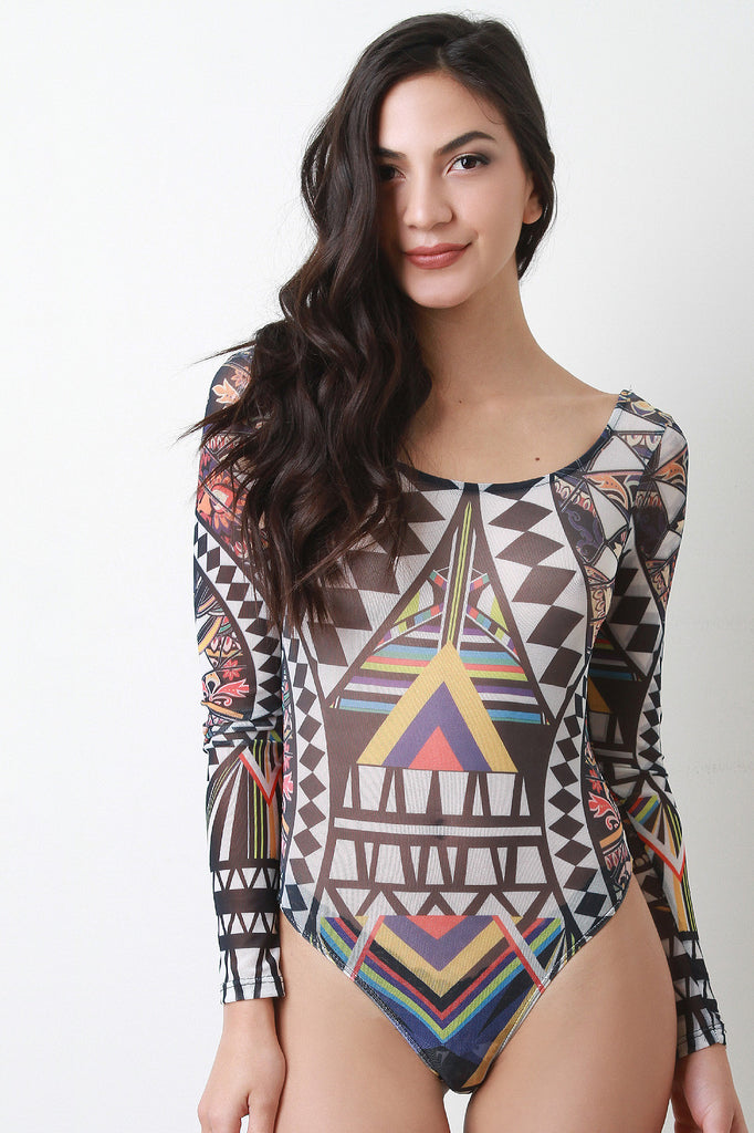 This bodysuit features a semi-sheer mesh fabrication, colorful geometrical print pattern, round neckline, and long sleeve construction, low cutback with bikini style bottom. Accessories sold separately. Made in U.S.A. 100% Polyester.