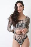 This bodysuit features a semi-sheer mesh fabrication, colorful abstract tribal print pattern, round neckline, long sleeve construction, and low cutback with bikini style bottom. Accessories sold separately. Made in U.S.A. 100% Polyester.
