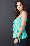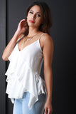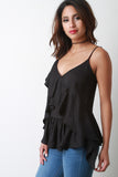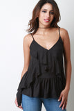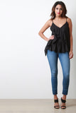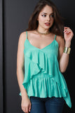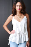 This ultra-feminine camisole top features a v-neck with an adjustable spaghetti-straps, sleeveless design, and ruffled panels cascading down the front. Accessories sold separately. 89% Rayon, 11% Nylon.