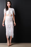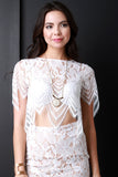 This beautiful top features a floral crochet lace fabrication, short sleeves, boat neckline, open back, scalloped raw hemlines, and cropped hemline. Finished with a single button hook at nape. Accessories sold separately. 100% Nylon.