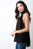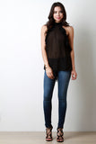 This chic top features a semi-sheer knit fabrication, mock neckline, ruffle details, open back, and self-tie long sash at nape. Finished with a button hook closure at back. Accessories sold separately. 100% Polyester.