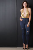 This bodysuit features iridescent metallic vegan leather, deep plunge neckline, and halter tie. Accessories sold separately. Made in U.S.A. 94% Polyester, 6% Spandex.