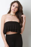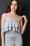 This crop top features jersey knit, tiered ruffle design, and strapless construction. Accessories sold separately. Made in U.S.A. 100% Rayon.