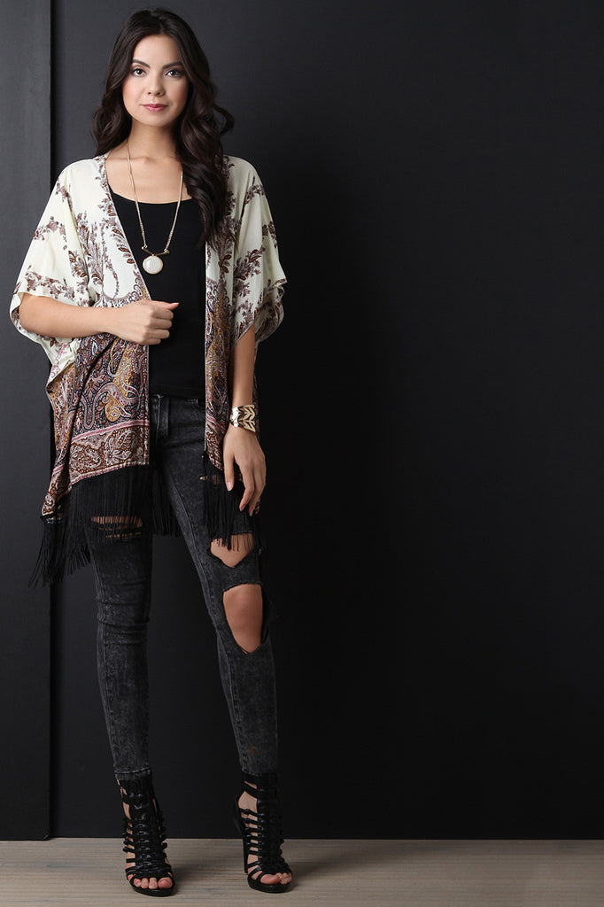 This kimono features paisley print, open front, short dolman sleeves, and fringe accent hemline. Accessories sold separately. 50% Polyester, 50% Cotton.