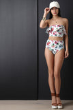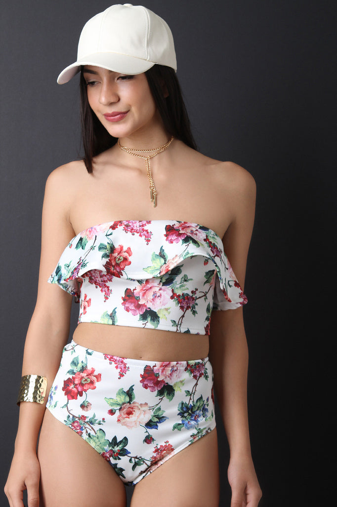 This strapless crop top features a painted style floral print pattern, knit fabrication, cropped hem and ruffle trim at neckline. Accessories sold separately. Made in U.S.A. 95% Polyester, 5% Spandex.