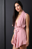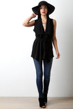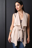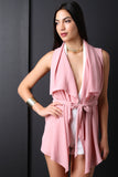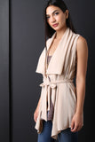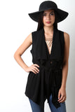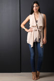This chic vest features a textured flowy knit fabrication, open front with self-tie waist sash, wide collar design, and handkerchief hemline. Accessories sold separately. Made in U.S.A. 100% Polyester.