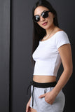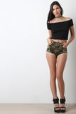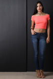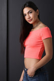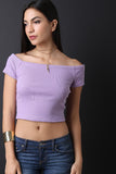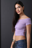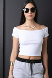 This crop top features a rib knit fabrication, off the shoulder neckline, short sleeves, curve hugging fit and a cropped hem. Accessories sold separately, 55% Cotton, 45% Polyester.
