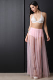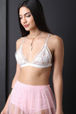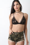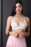 This bralette top features triangle cups, floral embroidered mesh lace, nude lining, x crochet trim, soft stretch knit band, adjustable elastic straps, and open triangle back details. Accessories sold separately. Self: 100% Nylon. Lining: 100% Polyester.