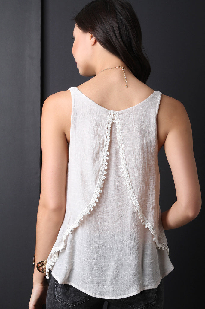 This breezy top features a sleeveless design, lightweight gauzy fabrication, v-neckline, loose flare hemline, double layer fabric, and split back with contract crochet lace trim. Accessories sold separately. Made in U.S.A. 100% Polyester