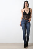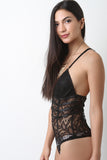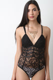 This sexy bodysuit features a triangle top, lace fabrication, multi strap design, elastic cage detailing, double snap closure at crotch. Accessories sold separately. Shell: 92% Nylon, 8% Spandex. Lining: 100% Polyester.