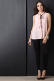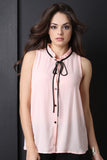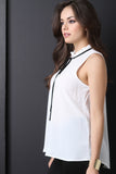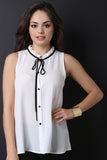 This classy sleeveless top features, a high neckline, ruffle collar contrast attached neck tie, front button closure, sheer chiffon fabrication, and a flare cut hemline. Accessories sold separately Made in U.S.A. 100% Polyester.