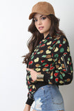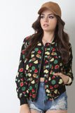 This quirky bomber style jacket features fruit print, rib knit trim, zip-up front, left arm zipper accent, and two pockets. Finished with lining. Accessories sold separately. 100% Polyester.