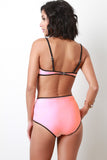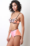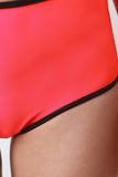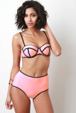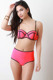 This bikini set features a molded foam cup with underwire, removable adjustable halter neckline, hook closure back, and contrasting top stitch trimming design. Bikini bottom features a high waisted cut, contrasting trimming, and fully lined. Accessory sold separately. 82% Polyamide, 18% Elastic. Lining: 100% Polyester.