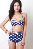 This retro inspired bikini set features bandeau top with molded foam padding, removable adjustable halter neckline, self-tie back, bold polka-dot and stripes design, and highlighted with a read pin stripe. Matching polka-dot bikini bottom features a high waisted construction, striped waist, and fully lined. Accessory sold separately. 82% Polyamide, 18% Elastic. Lining: 100% Polyester.