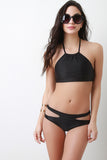 This bikini set features halter style top with self-tie strings. Bikini bottom features side cut-outs and finished with lining. Accessories sold separately. Shell: 80% Nylon, 20% Spandex. Lining: 100% Polyester.