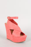 Featuring leatherette upper, wide cross straps, open toe design, strappy slingback style and platform wedge heel. Finished with lightly padded insole and adjustable ankle buckle.