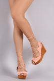 These lace up vamp with a peep toe opening and slingback strap. Designed on a faux wooden platform wedge, featuring a metallic gold trim accent on the toe box.