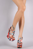 This alluring floral print satin upper, strappy caged design vamp, stitching accents, and wrapped platform wedge heel. Finished with lightly padded insole and adjustable ankle strap with buckle fastening.