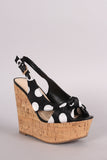 This glamorous peep toe polka dot print satin upper with a knotted detail at front vamp, cork platform, and wedge heel. Finished with lightly padded insole and adjustable slingback strap with buckle fastening.