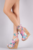 This peep toe floral print fabric upper, back cutout design, ankle strap with adjustable buckle closure, studded hardware accent platform, and cork wedge heel. Finished with a lightly padded insole for comfort.