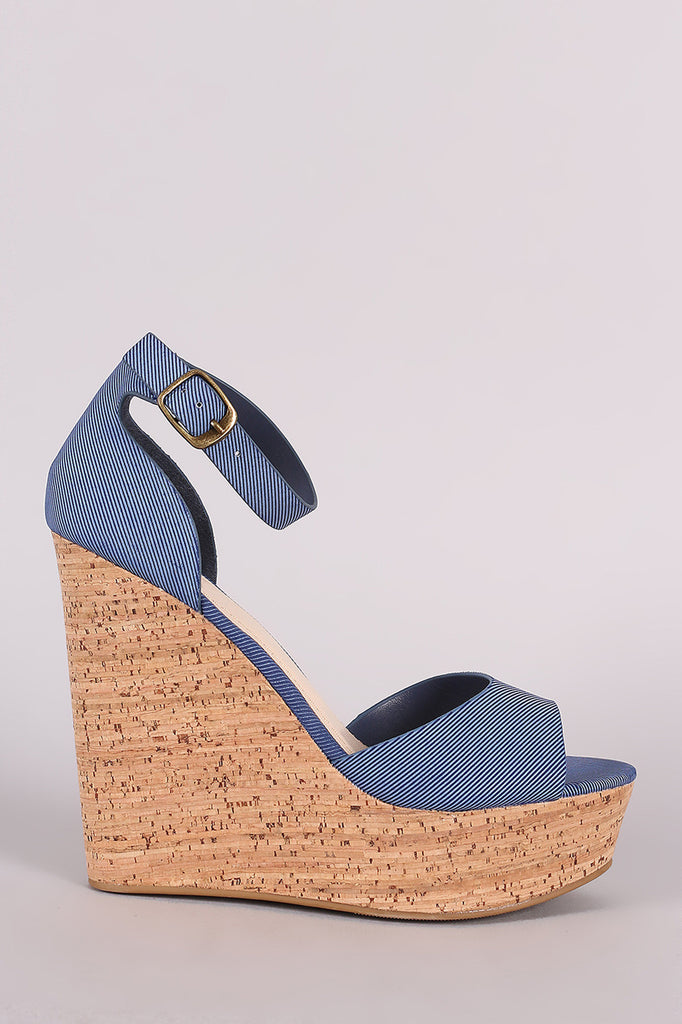 This stylish wedge features a denim/nubuck upper, one band across vamp, peep toe silhouette, and cork platform wedge heel. Finished with a lightly padded insole and ankle strap with side buckle closure.