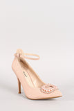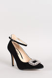 Light up the room with these beautiful pointy toe pumps! Featuring faux suede upper, pointy toe, pearl and rhinestone vamp decor, ankle strap with adjustable buckle closure, wrapped heel, stitching detail, and finished with cushioned insole for comfort.