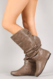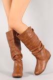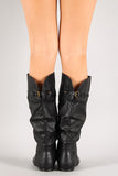 Featuring leatherette upper, slouchy shaft design, buckled strap embellishment at back, stitching detail, round toe, low flat heel, smooth interior lining, in an easy slip-on style.
