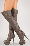 Featuring almond toe, chunky platform, wrapped stiletto heel, corset style straps at back, adjustable buckle strap, partial side zipper closure, stitching detail, and finished with cushioned insole for comfort.