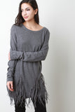 This soft lightweight dress features a round neckline, long sleeves, eyelet accent, and chevron pattern vegan suede fringe decor at front hemline. Accessories sold separately. 55% Viscose, 25% Polyester, 15% Nylon, 5% Angora.