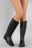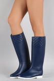 These fashionable  rain boots  feature a round toe silhouette, embossed quilted pattern at the top shaft, and low heel. Finished with cushioned insole and easy pull on construction.