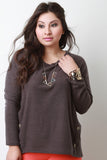 A plus size knit top featuring a round crew neck, long sleeves, and slanted faux button-up sides. Accessories sold separately. Made in U.S.A. 97% Polyester, 3% Spandex.