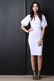 A midi sheath dress featuring smooth fabric with a slight sheen, a wide neckline, and mid-length bishop sleeves. Finished with vertical seams design and a scooped back neckline. Accessories sold separately. Made in USA. 95% Polyester, 5% Spandex.