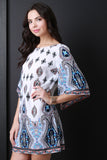 This dress features a round neckline, short sleeves, shift cut fit, scoop back with a self-tie bow at nape, and bohemian pattern print design. Accessories sold separately. 100% Polyester.