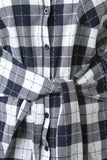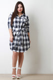 A plus size shirt dress featuring soft plaid fabric, button-up front, and full-length sleeves. Finished with a self-tie waist design and curved hem. Accessories sold separately. 100% Cotton.
