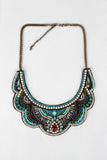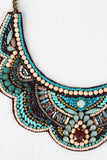 A scallop shape bib necklace featuring a beaded pattern front, acrylic gem embellishments, and flat curb link chain with an adjustable lobster hook closure.