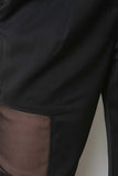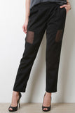 These pants feature solid main, semi-sheer mesh panel accents, two side pockets, partially elasticized waist, and taper cut. Accessories sold separately. Self: 97% Polyester, 3% Spandex. Contrast: 100% Polyester.