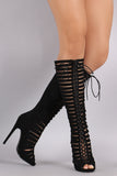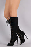 Suede Peep Toe Strappy Caged Stiletto Boots