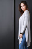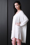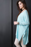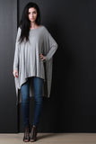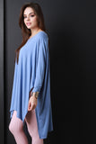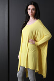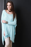 This oversized top features soft jersey knit, scoop neckline, long dolman sleeves, side slits, and high-low hemline. Accessories sold separately. Made in U.S.A. 93% Rayon, 7% Spandex.