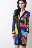 This bodycon dress features vibrant abstract floral print design, wide contrasting panel trimming, plunging v-neckline to a zipper fastener at front, long sleeves, and shoulder pad finish. Made in U.S.A. Accessories sold separately. 95% Polyester, 5% Spandex.