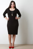 This plus size midi dress features a round neckline, three quarter sleeves, double layered stretchy sculpture fit. Accessories sold separately. Made in U.S.A. 95% Rayon, 5% Spandex.