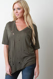 This feather weight jersey knit t-shirt features a v-neckline, short sleeves, casual relax fit, and distress holey cutout at front. Accessories sold separately. Made in U.S.A. 100% Rayon.