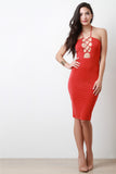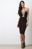 This bodycon dress features a self tie crisscross bodice design, a plunging neckline, sleeveless construction and finished with an open back. Accessories sold separately. Made in USA. 95% Polyester, 5% Spandex.