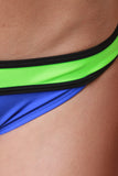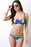 This two piece bikini set features vibrant color panels with black trimming, bandeau structure top, foam padded cups, underwire, removable adjustable shoulder straps, and hook closure back. Low rise bikini bottom features cheeky bottom, and fully lined. Accessories sold separately. 82% Polyamid, 18% Elastan. Lining: 100% Polyester.